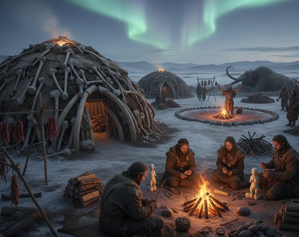 ホモ・サピエンスは、寒冷地で入手可能な資源を活用する知恵を持っていました。コステンキ遺跡やウクライナのメジリチ遺跡など、ロシア・ウクライナ周辺からは、巨大なマンモスの骨でできた住居跡が数多く見つかっています。これらは、寒さを凌ぐための実用的な住居であると同時に、部族のシンボルとして象徴的な意味を持った可能性も指摘されています。